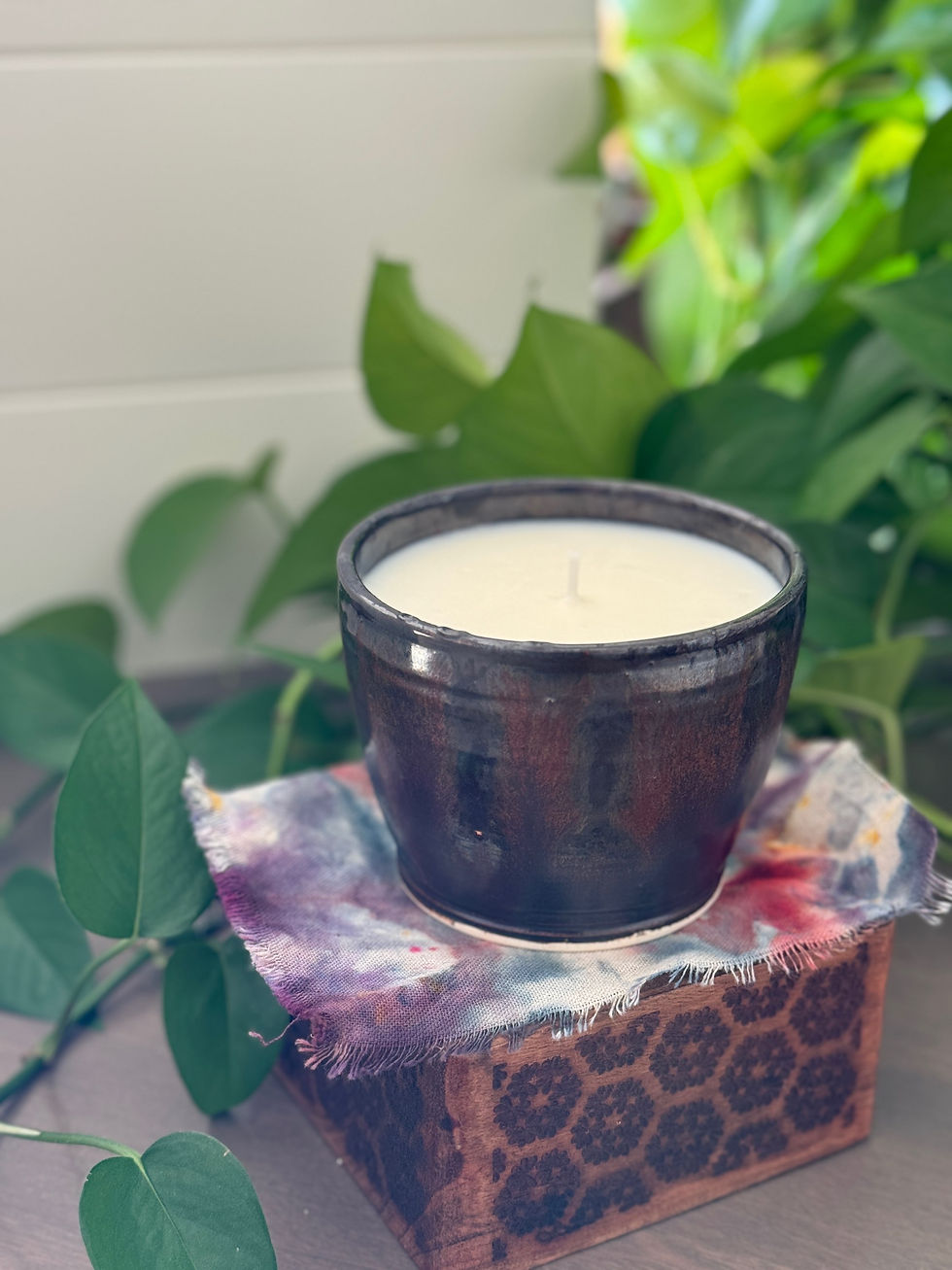 Every pottery candle is wheel-thrown, hand trimmed, and uniquely decorated with glaze, sgraffito, or carvings. Each one is filled with hand-poured soy wax in a variety of interesting scents, and some have added embellishments of crystals or quotes.